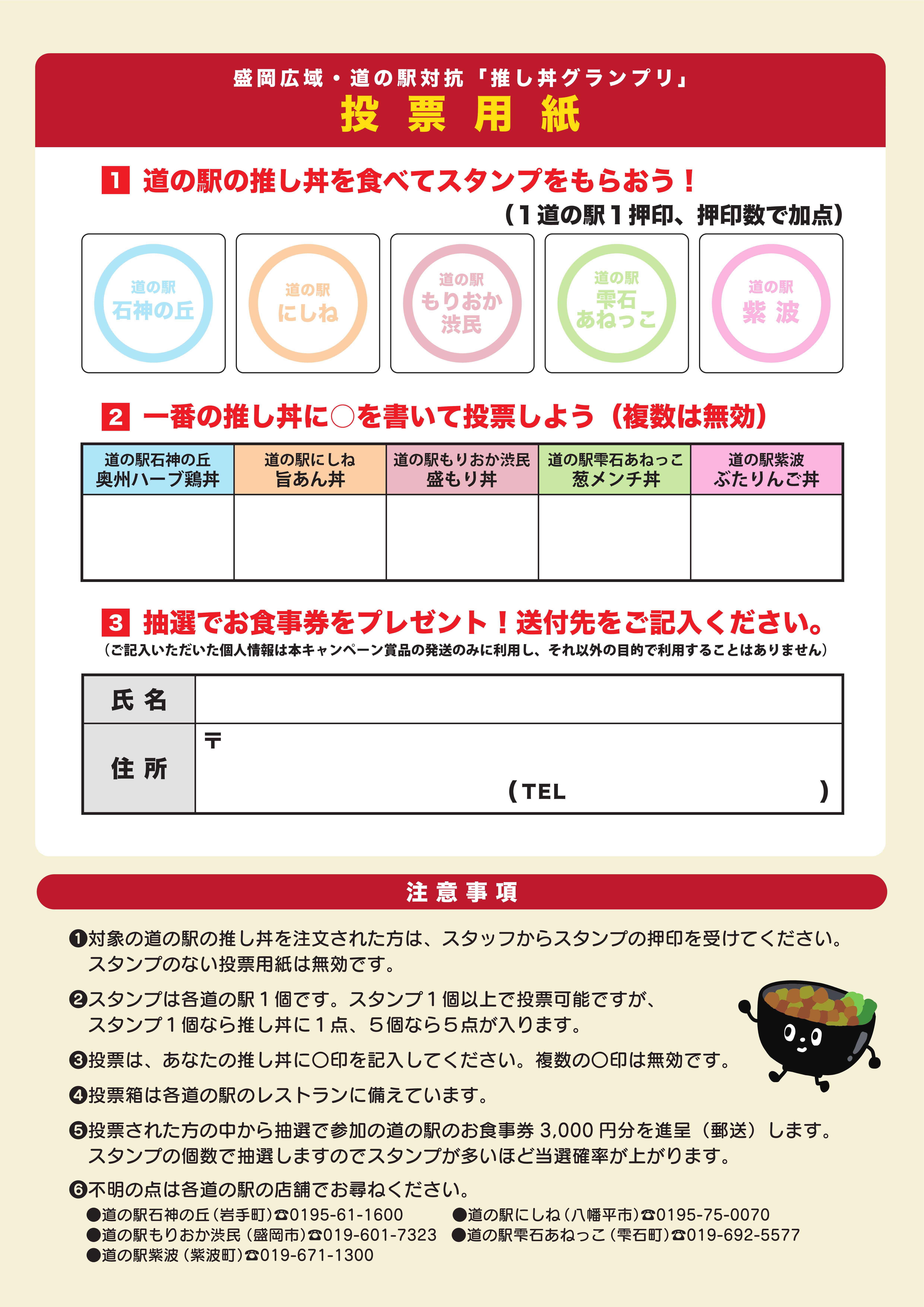投票用紙にお気に入りの推し丼を1つ記入し、盛岡広域の5つの道の駅に設置されている投票箱へ投函してください。投票いただいた方の中から抽選で、盛岡広域の5つの道の駅で使えるお食事券が当たります。